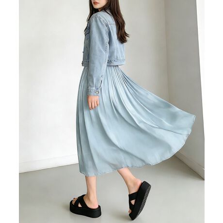 光沢感があり、なめらかな質感が特徴のフレアスカート