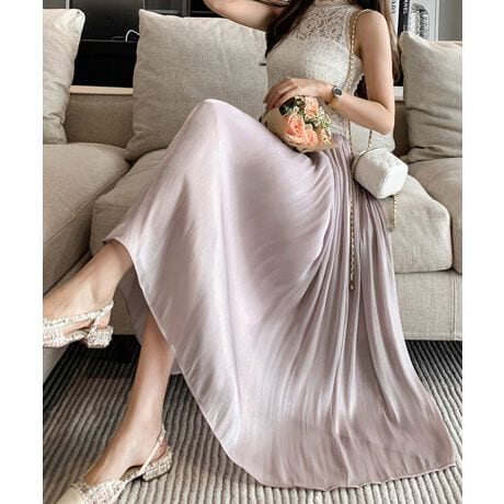 光沢感があり、なめらかな質感が特徴のフレアスカート