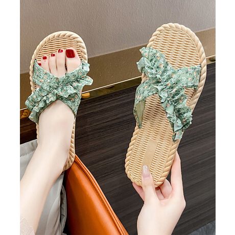 繊細な小花柄×フリルデザインが、さりげなく可愛らしさを引き出してくれるサンダル。