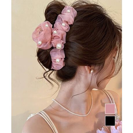 やわらかなシアー素材にパールをあしらった、上品なヘアアクセサリー。