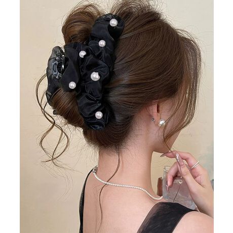 やわらかなシアー素材にパールをあしらった、上品なヘアアクセサリー。