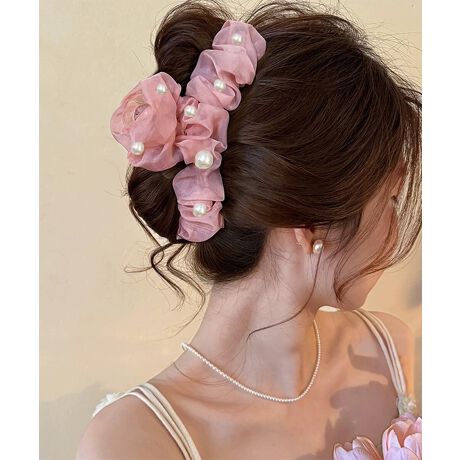 やわらかなシアー素材にパールをあしらった、上品なヘアアクセサリー。