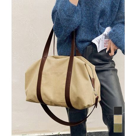 キャンバス素材にフェイクレザーハンドルを組み合わせた、抜け感のある大容量ボストンバッグ。