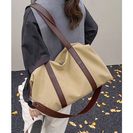 キャンバス素材にフェイクレザーハンドルを組み合わせた、抜け感のある大容量ボストンバッグ。
