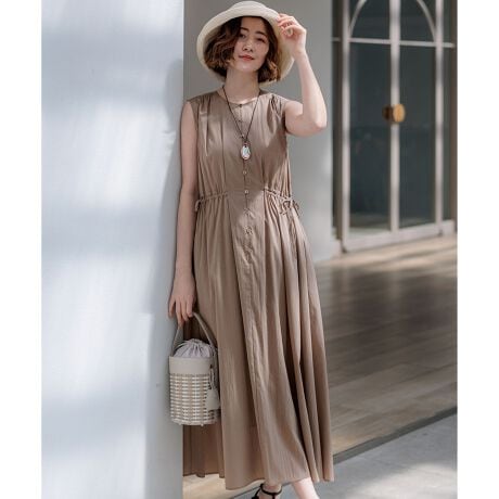 ウエストサイドにあしらわれたドローストリング(引き紐)で、お好みのフィット感にシルエットを調節できるワンピースです。ウエスト位置を高めに設定することで、全身のバランスが整い、すっきりとした印象に仕上がります。フロントのボタンデザインはアクセントになりつつ、途中から縫い止めている仕様のため、動いても裾がはだけることなく着用いただけます。肩周りから流れるような繊細なギャザーが、女性らしい柔らかな雰囲気を演出。一枚でさらりと着こなすのはもちろん、カーディガンやジャケットを羽織れば、春先から盛夏まで長く活躍します。デイリー使いからリゾートシーンまで、幅広い場面で心地よく過ごせる一着です。カラーは、肌なじみが良く軽やかなライトシナモン(#034)、こなれ感のあるニュアンスカラーのモカ(#030)、グレーみを帯びた落ち着いたダークブラウン(#035)の3色展開です。
