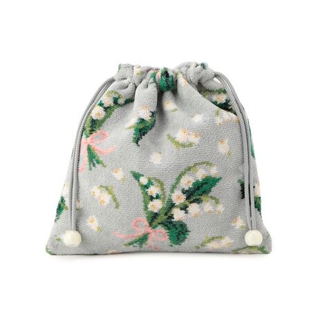 幸せを象徴する花、すずらんをフェミニンに表現した「ピュールミュゲ」の巾着です。使い勝手のよいサイズ感で、見た目以上にたっぷり収納可能。身支度に必要な小物をまとめたり、日常で使うバッグの中の整理にも重宝します。軽くてかさばらず、デイリーから旅行のときにもお使いいただけるアイテムです。