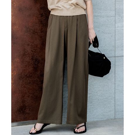 フロントにタックを施し、ゆとりを持たせたリラックス感のあるワイドパンツです。広がりすぎない絶妙なシルエットが、大人の余裕を感じさせる洗練された印象を与えます。シンプルなTシャツやニットと合わせるだけで、こなれ感のあるスタイリングが決まります。ブラウスやジャケットと合わせれば、オフィスシーンにも馴染む汎用性の高さも魅力です。足元はサンダルで軽やかに、パンプスで引き締めてと、幅広いコーディネートをお楽しみいただけます。カラーは、どんな色とも相性が良く柔らかな印象のベージュ(#033)、落ち着いたトーンでシックに決まるカーキ(#054)、知的で洗練された雰囲気のネイビー(#075)の3色展開です。