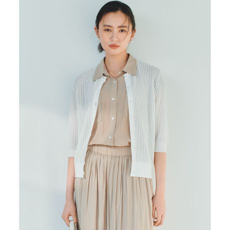 ■素材・糸をなめらかにする紡績技術により、毛羽が少なく上品な光沢感のある糸に仕上げています。・目面が綺麗でシャリ感のある爽やかな風合いが特徴です。・軽い着心地とさらっとした肌触りで、体のラインを拾いすぎない程よい生地の厚さになるようこだわりました。・レースを並べたような縦ラインを強調した編み柄にすることで甘さを抑え、デイリー使いしやすい大人可愛さのある表情を表現しています。