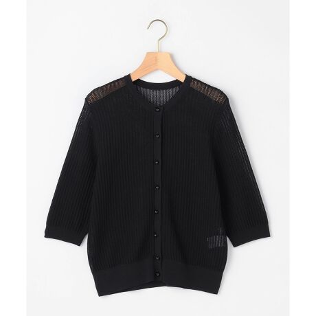 ■デザイン・レースのような編み柄を活かした、襟元のあきが女性らしいシンプルな五分袖ニットカーディガン。・前後着用可能な2WAY仕様で、Tシャツ感覚でトップスのようにも使える優秀アイテム。・レースのように編み立てることで、通常よりもやや体から離れるシルエットながら、もたつきがなく首や肩が美しく見えるように絶妙なサイズ感にこだわりました。・キャンディのような可愛らしい釦が、シンプルなデザインにさりげないチャームポイントになっています。・同素材のスカート(品番: SKWXLM0550)とのセットアップであわせるスタイルもおすすめです。
