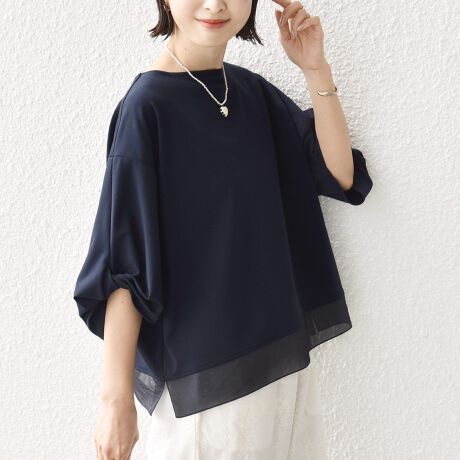 さらっと着るだけで主役になるブラウス見えの異素材ドッキングデザインTシャツです。