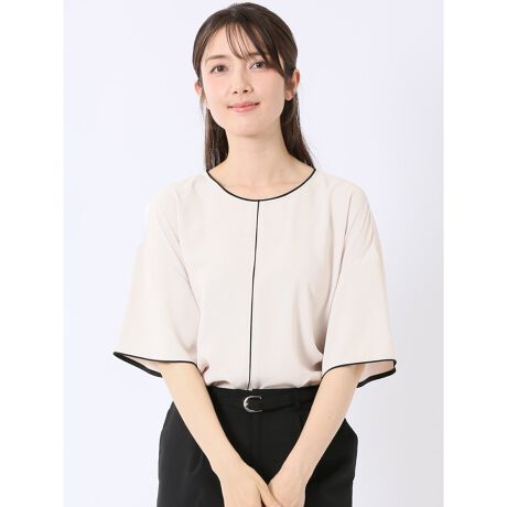 Tシャツのような着心地とブラウスの持つ上品なルックスを兼ね備えた、半袖のプルオーバーブラウスです。すっきりとしたクルーネック、配色のパイピング、背中の涙開きがポイント。キチンと感があるのでオンオフ兼用で大活躍してくれます。