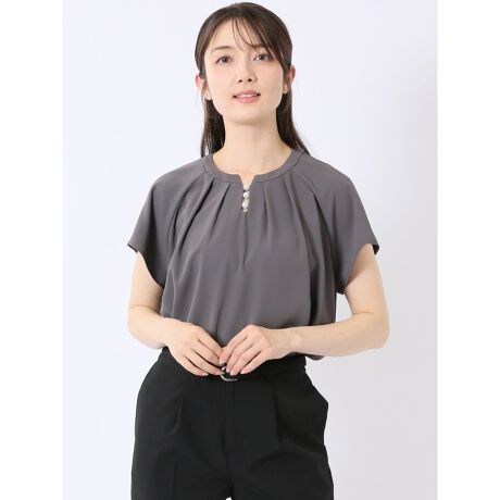 Tシャツのような着心地とブラウスの持つ上品なルックスを兼ね備えた、半袖のプルオーバーブラウスです。すっきりとしたキーネック、大き目な人口パール、立体感のあるタック、背中の涙開きがポイント。キチンと感があるのでオンオフ兼用で大活躍してくれます。