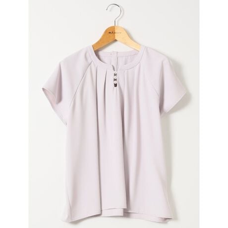 Tシャツのような着心地とブラウスの持つ上品なルックスを兼ね備えた、半袖のプルオーバーブラウスです。すっきりとしたキーネック、大き目な人口パール、立体感のあるタック、背中の涙開きがポイント。キチンと感があるのでオンオフ兼用で大活躍してくれます。