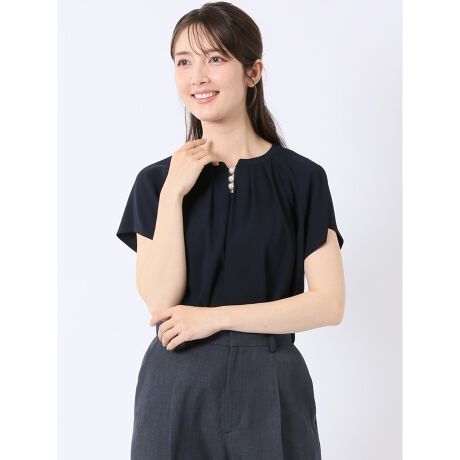 Tシャツのような着心地とブラウスの持つ上品なルックスを兼ね備えた、半袖のプルオーバーブラウスです。すっきりとしたキーネック、大き目な人口パール、立体感のあるタック、背中の涙開きがポイント。キチンと感があるのでオンオフ兼用で大活躍してくれます。