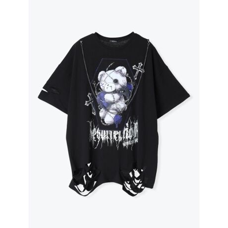 [型番:26590061010]イチゴとクマのゴシック調のイラストが目を惹くTシャツ。付属のチェーンは取り外しできるので、その日の気分に合わせた着こなしを楽しめます。裾のダメージ加工がスタイリングのアクセントに。デイリーはもちろん、休日のお出かけにも活躍するアイテムです。NOEMIE/ノエミー/水色界隈系/水色系統/天使界隈系/天使界隈系女子/サブカル/サブカル系/サブカル女子/サイバー系/ゆめかわ/参戦服/双子コーデ/お揃いコーデ/tenshikaiwai/cyber