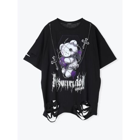 [型番:26590061010]イチゴとクマのゴシック調のイラストが目を惹くTシャツ。付属のチェーンは取り外しできるので、その日の気分に合わせた着こなしを楽しめます。裾のダメージ加工がスタイリングのアクセントに。デイリーはもちろん、休日のお出かけにも活躍するアイテムです。NOEMIE/ノエミー/水色界隈系/水色系統/天使界隈系/天使界隈系女子/サブカル/サブカル系/サブカル女子/サイバー系/ゆめかわ/参戦服/双子コーデ/お揃いコーデ/tenshikaiwai/cyber