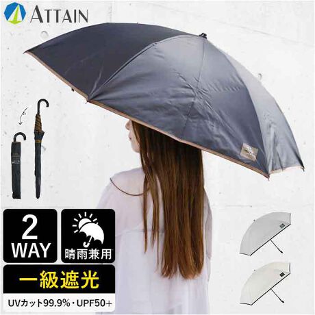 【2WAY設計で晴れも雨も万全】長傘にも折り畳みにもなる「ATTAIN 晴雨兼用2段折り 2WAY 6本骨傘」。【遮光性能は最高峰】一級遮光・UVカット99.9%・UPF50+と、紫外線対策が揃ったハイスペック傘◎【遮熱効果で夏も快適】じりじりと照りつける強い日差しも遮熱効果でしっかりカバーし、外出中の暑さを軽減!【2WAYで使い方自由】長傘にも折り畳み傘にもなる2WAY設計で、その日のシーンに合わせて気軽に選べる仕様。【コンパクトに携帯可能】収納時はすっきりまとまり、通勤バッグにも無理なく入るスリムな収まりのよさ〇【指先まで気遣う設計】手開き部分にはカバーがついているから、傘を開く瞬間も指を挟まず安全に使えて毎日が楽♪