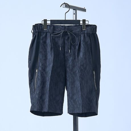 全面に表情のあるジャカードを使用し、サイドを無地で切り替えたハイブリッドデザイン。縦に走るラインが視線を流し、ややタイトに整えたシルエットをよりシャープに演出します。ウエストは脇のみゴムを配し、内外どちらにも出せる2WAYドローコード仕様。ベルトループも備え、イージーな穿き心地ながらクリーンな印象に。膝にかからないバランスの取れたレングスです。