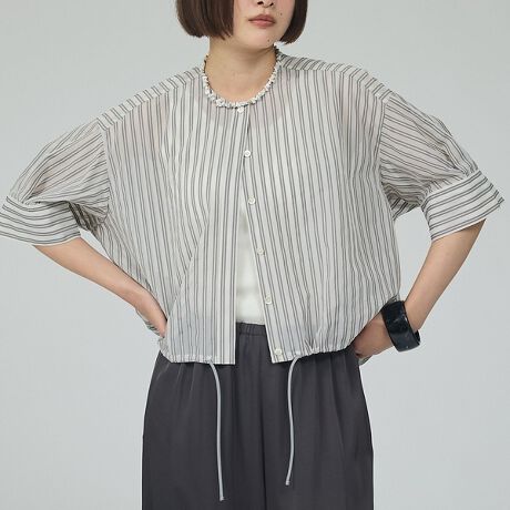 フロントボタンの前開きデザインに、裾のドローストリングを備えたブラウスです。