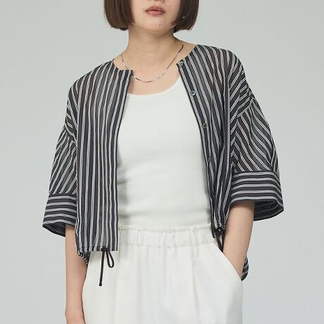 フロントボタンの前開きデザインに、裾のドローストリングを備えたブラウスです。