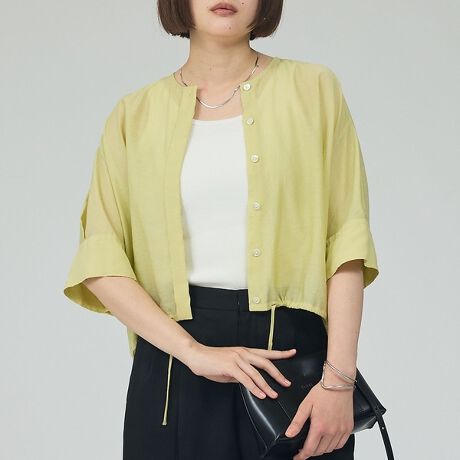 フロントボタンの前開きデザインに、裾のドローストリングを備えたブラウスです。