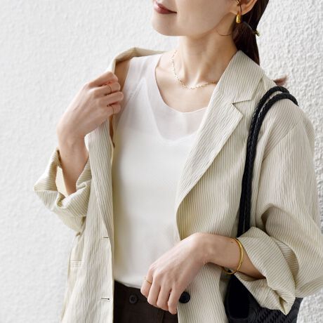 お手持ちの羽織シャツやジャケットを着た際にシンプルなインナーだとコーディネートにポイントが足りない時にこちらのタンクトップを着るだけで一気に羽織が今年らしく華やかな印象に変わります。