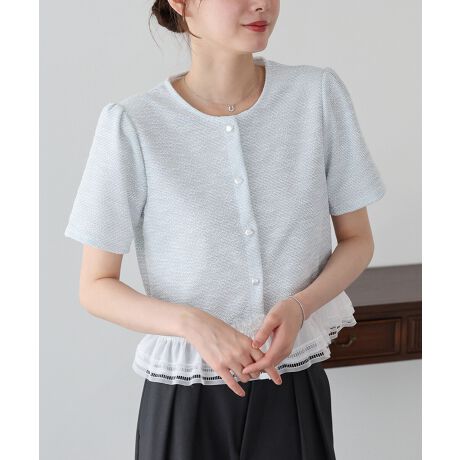 裾にドッキングされたレースが、きちんと感のあるジャケットスタイルに軽やかさと女性らしい抜け感をプラス。