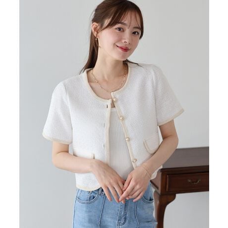 クラシカルなツイード素材に、配色のパイピングを効かせたトレンド感のあるノーカラー半袖ジャケット。