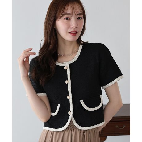 クラシカルなツイード素材に、配色のパイピングを効かせたトレンド感のあるノーカラー半袖ジャケット。
