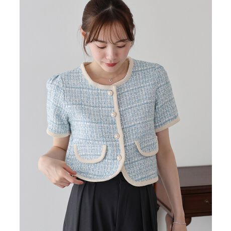 クラシカルなツイード素材に、配色のパイピングを効かせたトレンド感のあるノーカラー半袖ジャケット。