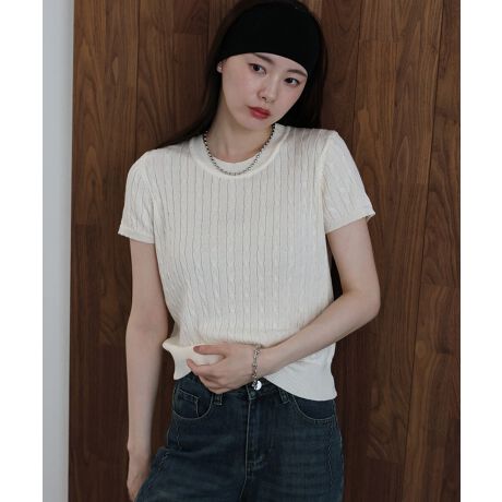 ケーブル編みの豊かな表情を、モードな印象へと昇華させた半袖ニットプルオーバー。