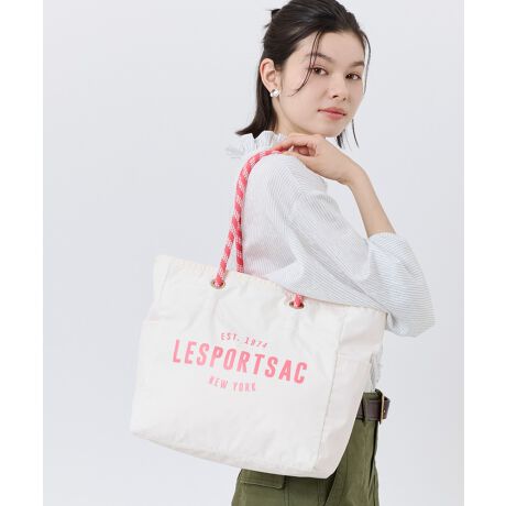 柔らかなホワイトベースに、ピンクのLeSportsacロゴプリントとロープハンドルがアクセント。