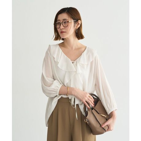 軽やかなシアー素材にラッフルとリボンをあしらったブラウス。
