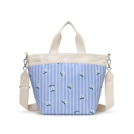 ソフトなペールブルーとホワイトの爽やかなストライプに、花々がアクセントに。ギフトにもおすすめのデザインです。