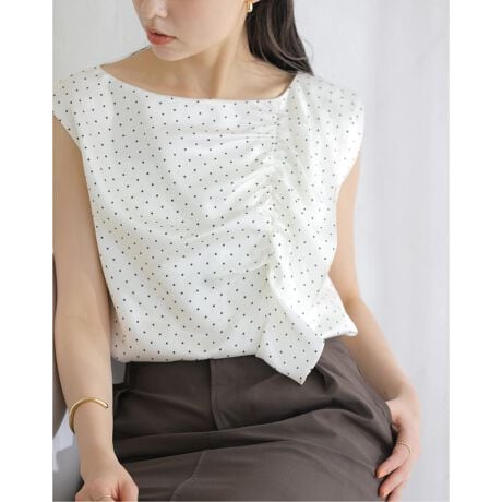 アシンメトリーに寄せたギャザーが自然な立体感を生み、シンプルながらも一枚で華やかなスタイルに仕上がります。