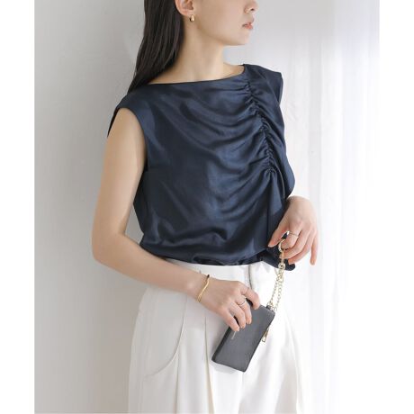 アシンメトリーに寄せたギャザーが自然な立体感を生み、シンプルながらも一枚で華やかなスタイルに仕上がります。