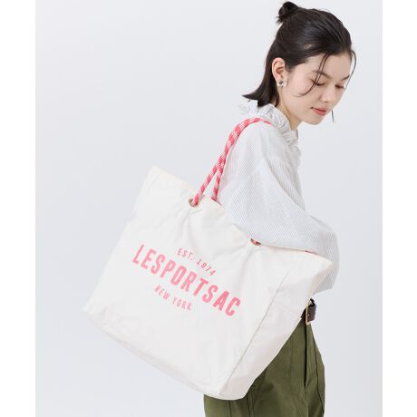 柔らかなホワイトベースに、ピンクのLeSportsacロゴプリントとロープハンドルがアクセント。