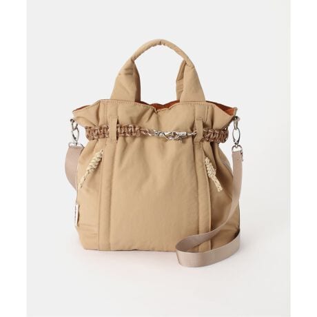 コーディネートに合わせて持ち手を変えられるので、飽きることなく楽しめます。撥水生地を使用しているので、急な雨やレジャーシーンにも活躍し、ペットボトルも収納可能でちょうどいいサイズ感のバッグです。使い勝手の良いフロントポケット付きです。