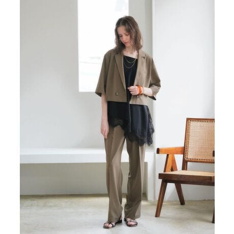 同素材のジャケットとのセットアップ着用もおすすめです。