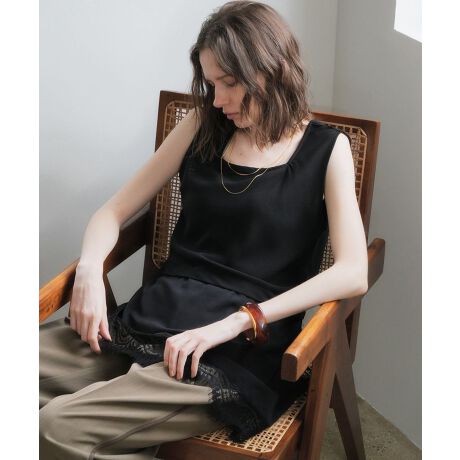 アシンメトリーにデザインされた繊細なレースヘムが印象的なノースリーブブラウス。