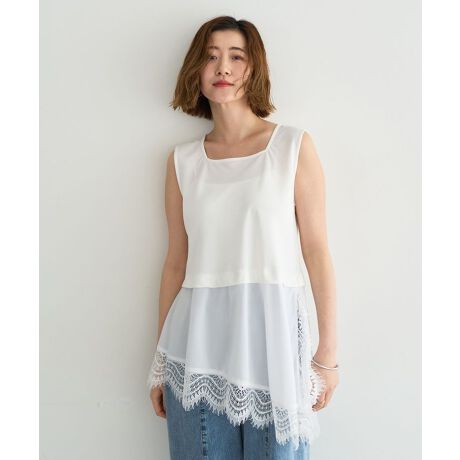 アシンメトリーにデザインされた繊細なレースヘムが印象的なノースリーブブラウス。
