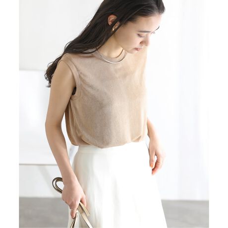 さりげない光沢感が上品なシャイニーノースリーブトップス。