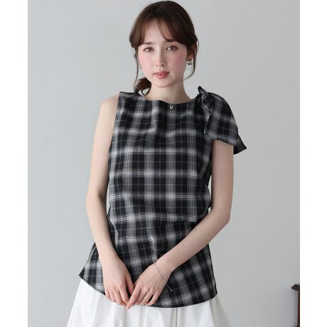 アシンメトリーデザインがおしゃれなショルダーリボンチェックブラウス