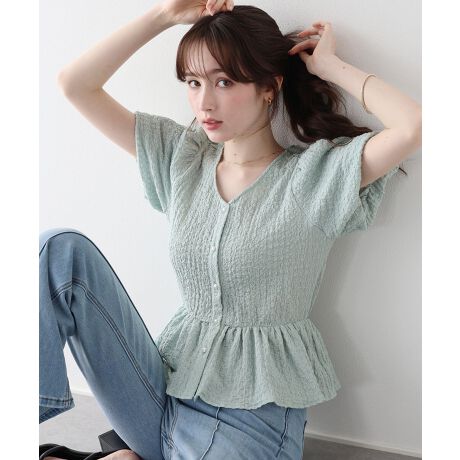 凹凸感のあるポコポコとした素材感がポイントのペプラムトップス。