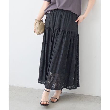 幾何柄と花柄を組み合わせたレースが目を惹く程よい分量のティアードデザインのギャザーキリカエスカート。