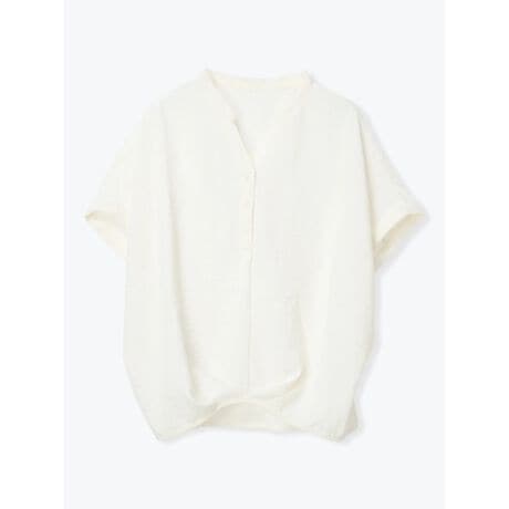 [型番:26550721820]フロントインしたようなタケノコタックが魅力的なシャツ。ゆったりとした落ち感のあるシルエットになっており、こなれ感を楽しめます。首元のV字切り込みがさりげない抜け感をプラス。パンツと合わせたきれいめなコーディネートがおすすめです。