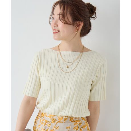 すっきりとしたボートネックが上品な印象のハーフスリーブニット。