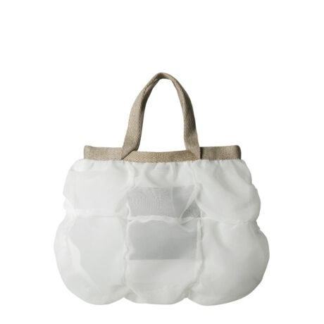 工業用のポリエステル素材にギャザーを施し、白にはイタリア製の麻テープを、黒には牛革を組み合わせました。