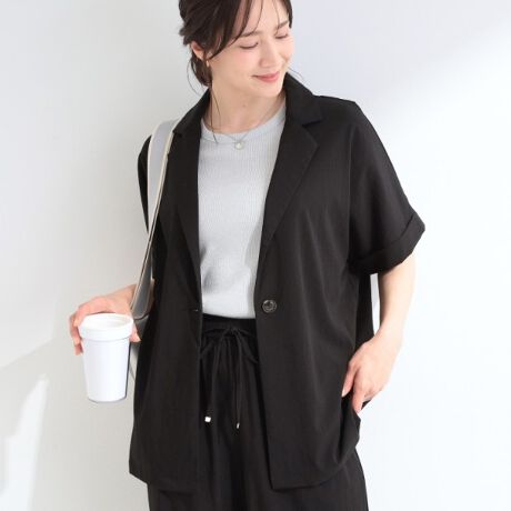 ひんやりが嬉しい、少しハリのある特徴的な素材を使用した半袖ジャケットです。