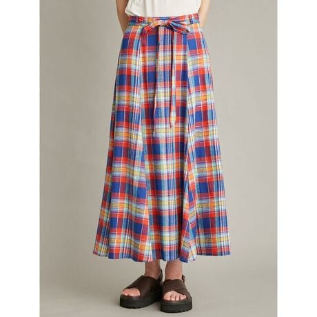そっと夏の気配を感じさせる、華やかなマドラスチェック。歩くたびにふんわり広がるサーキュラーデザインで、軽やかで涼しげな印象。前に長めのスリットを入れ、足さばきの良さと抜け感を両立。</p><p><strong>【Design】</strong>